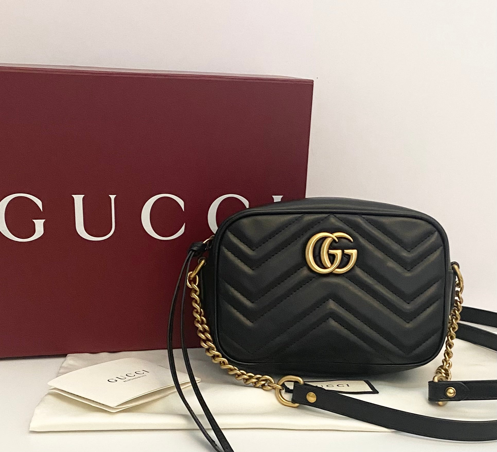 Indulge in the Gucci Black Marmont Mini Crossbody Bag. Crafted with luxurious chevron matelasse leather and accented with gold hardware, this accessory exudes effortless chic and sophistication. Perfect for any occasion, it can be worn over the shoulder or as a crossbody, making it versatile and ideal for those who prefer a hands-free option.