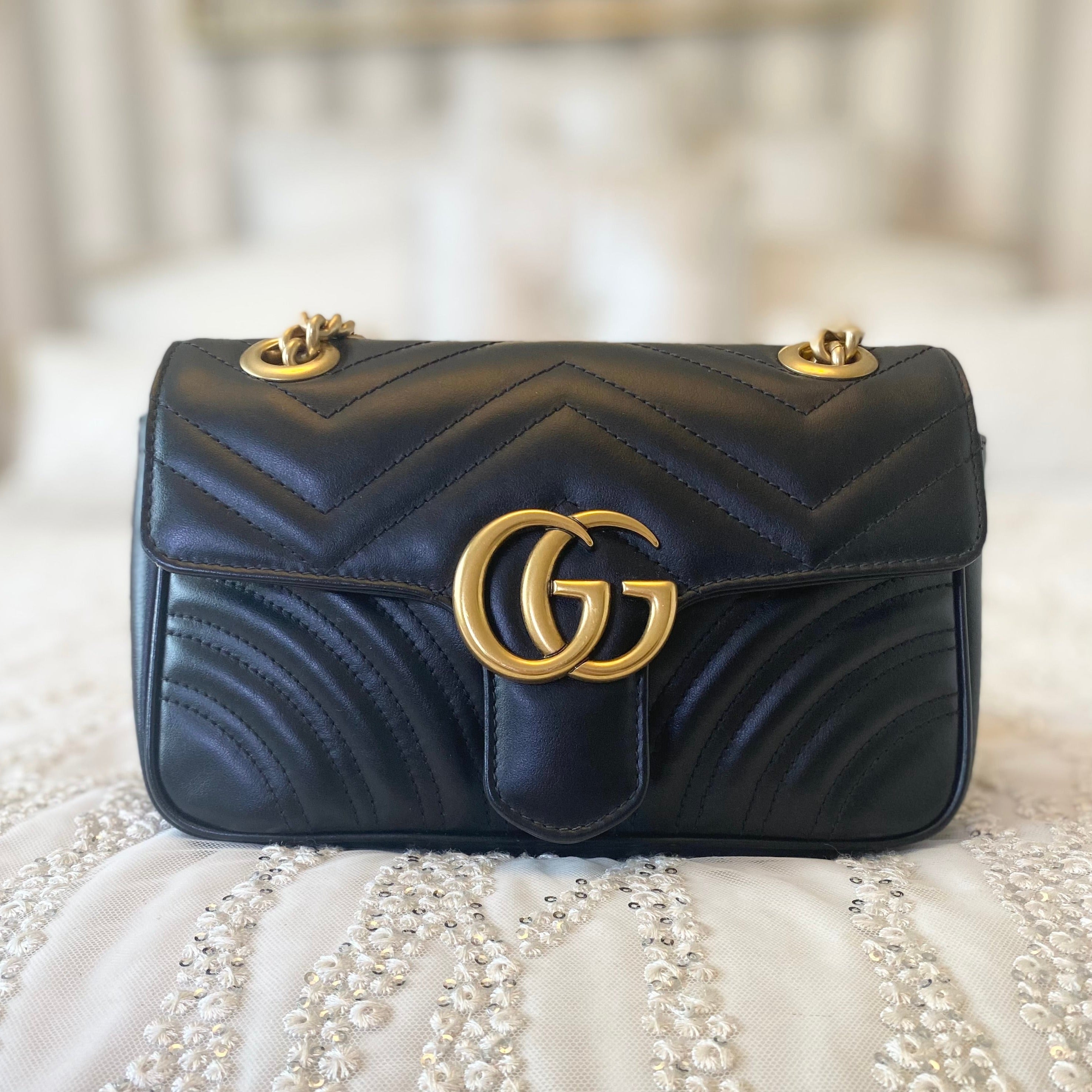 Experience luxurious style with the Gucci Black Marmont Mini Handbag. Crafted in matelasse chevron leather and adorned with gold toned hardware, this bag features a sliding chain that allows for versatile wear as a crossbody or shoulder bag. Perfect for any occasion, this bag adds a touch of sophistication to any outfit, whether it's casual or dressy. Ideal for those who appreciate a chic crossbody option. Pristine condition.