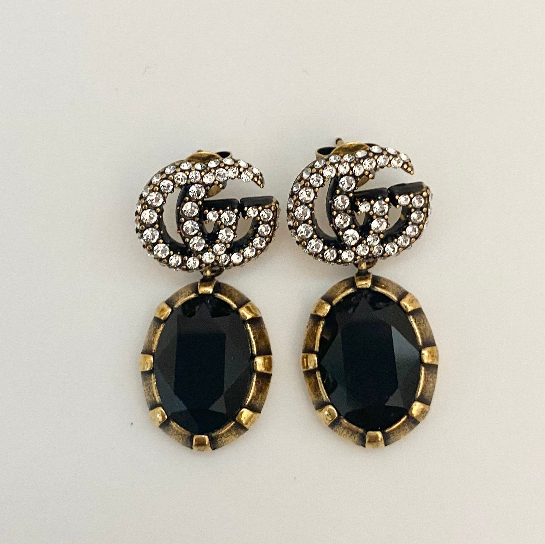 MATERIAL: Metal with aged gold finish, Crystal encrusted double g detail, Black crystal pendants with metal frame.