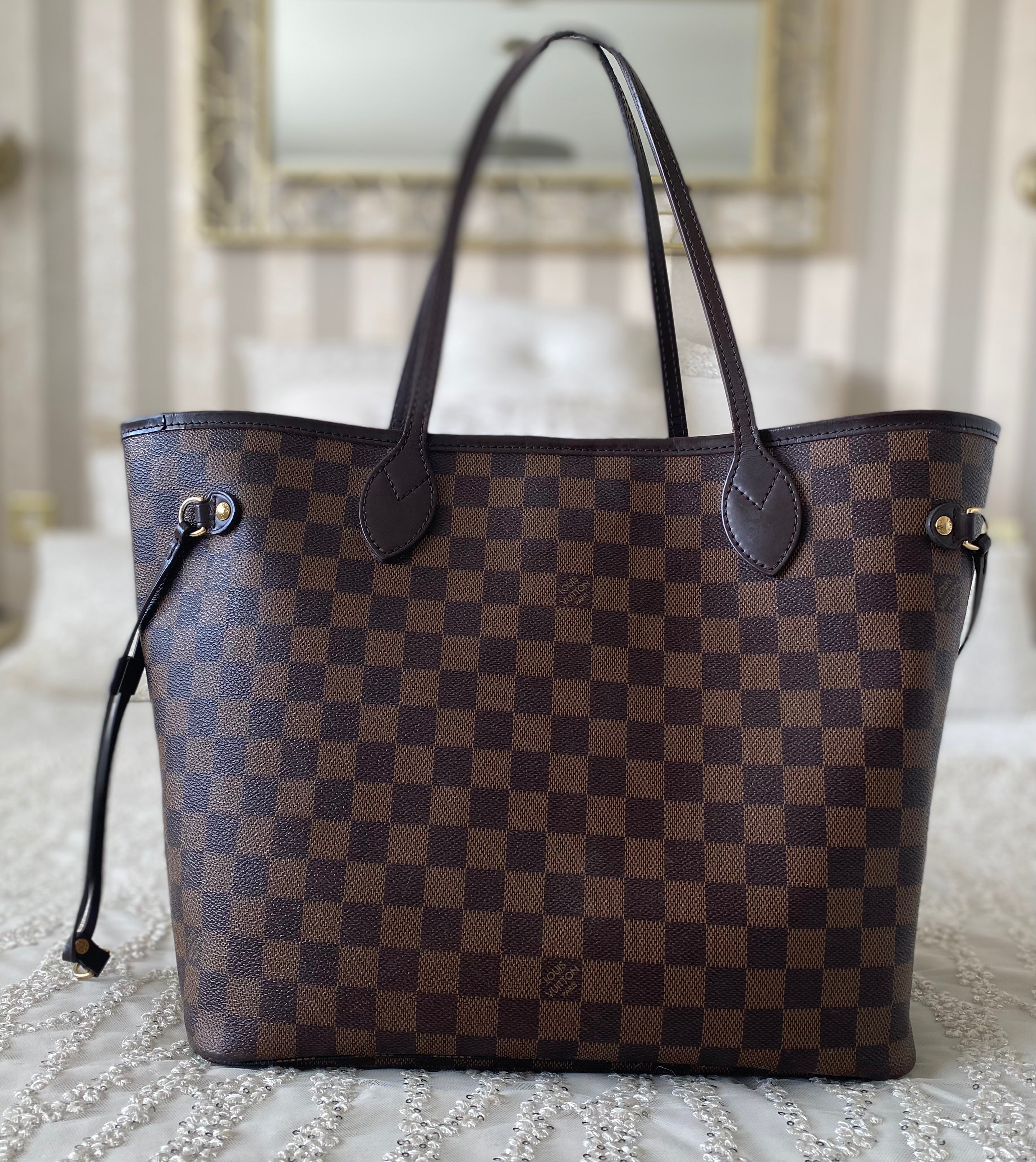 This iconic Louis Vuitton Neverfull MM in Damier Ebene with Cherry Red Lining is the perfect combination of trendiness and durability. This popular style is ideal for day to day or work use, with its spacious interior and chic design. Versatile enough to be carried in multiple ways, this bag is a must-have for any fashion enthusiast. Please note that the removable clutch pouch is not included. Very good condition, with signs of use.   Add Handbag Liner to help maintain structure, & organise your items